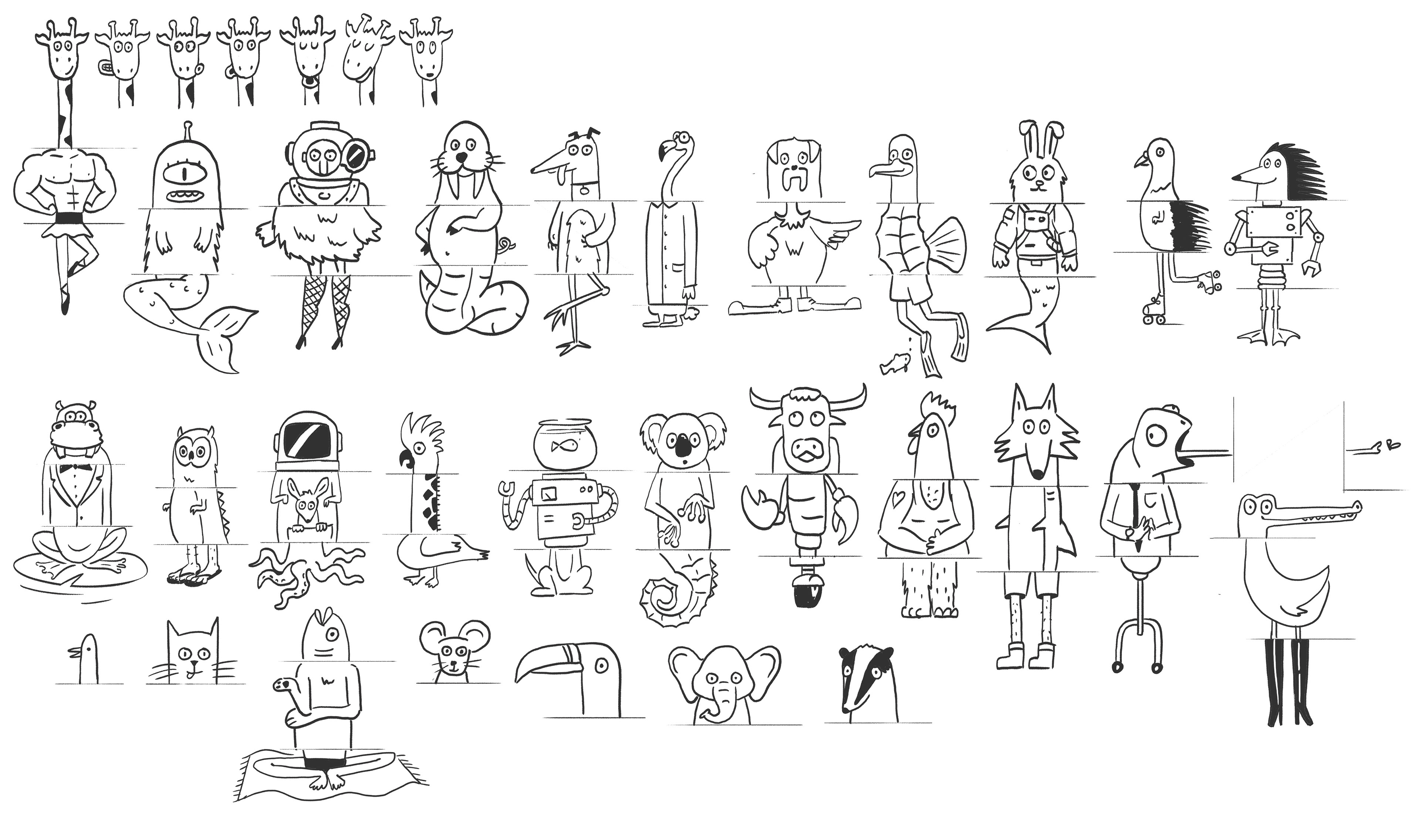 One of my favourite drawing games is exquisite corpse. The original pitch had each character made up of random parts. The idea being that things can get a little mixed up when you move house. Unfortunately the client decided that they wanted 'real' people and they wanted them whole.